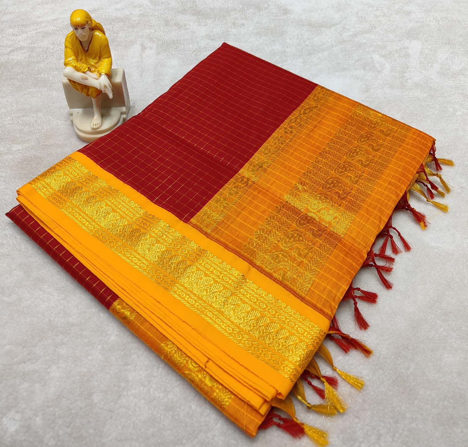 Kalyani Cotton Saree with Lata Gadwal Paithani checks in a soft acrylic blend. This 6.25-meter saree delivers lightweight comfort and breathability for everyday wear, office settings, and festive occasions. The smooth texture and classic design make it a versatile addition to your wardrobe.