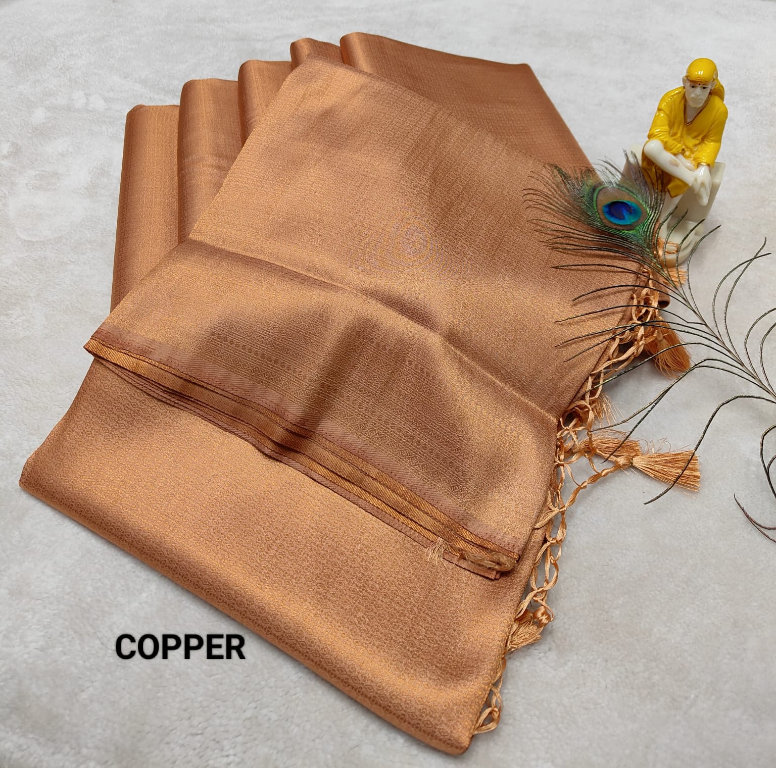 Experience the rich elegance and luxurious feel of our Soft Silk Saree! With a beautiful Copper Zari border and grand pallu, this saree elevates your style effortlessly. Available in multiple colors, this saree promises a rich look for any occasion. Treat yourself to the ultimate saree experience!