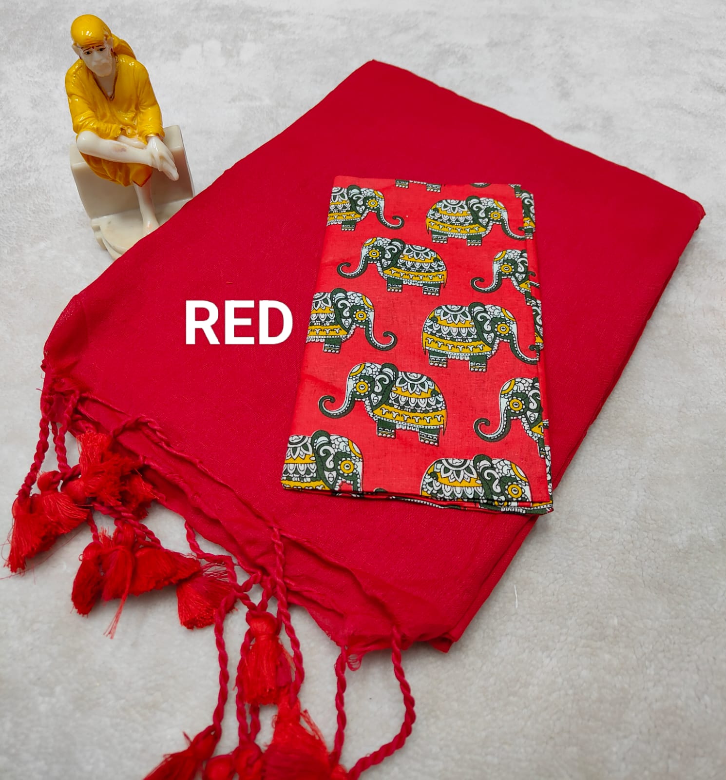 The beauty of this collection lies in its simplicity — a graceful plain Khadi cotton body paired with a free attractive Kalamkari printed blouse, adding a vibrant artistic touch to your look. The lightweight weave ensures all-day comfort, while the premium finish gives you a classy, timeless appearance.